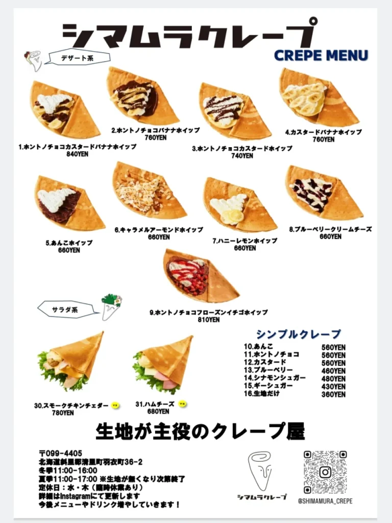 北海道斜里郡清里町に、待望のニュースが飛び込んできました! 全国で「生地が美味しすぎる」と話題のヤマグチクレープFC加盟店「シマムラクレープ」が、2026年1月18日(日)にグランドオープンします。